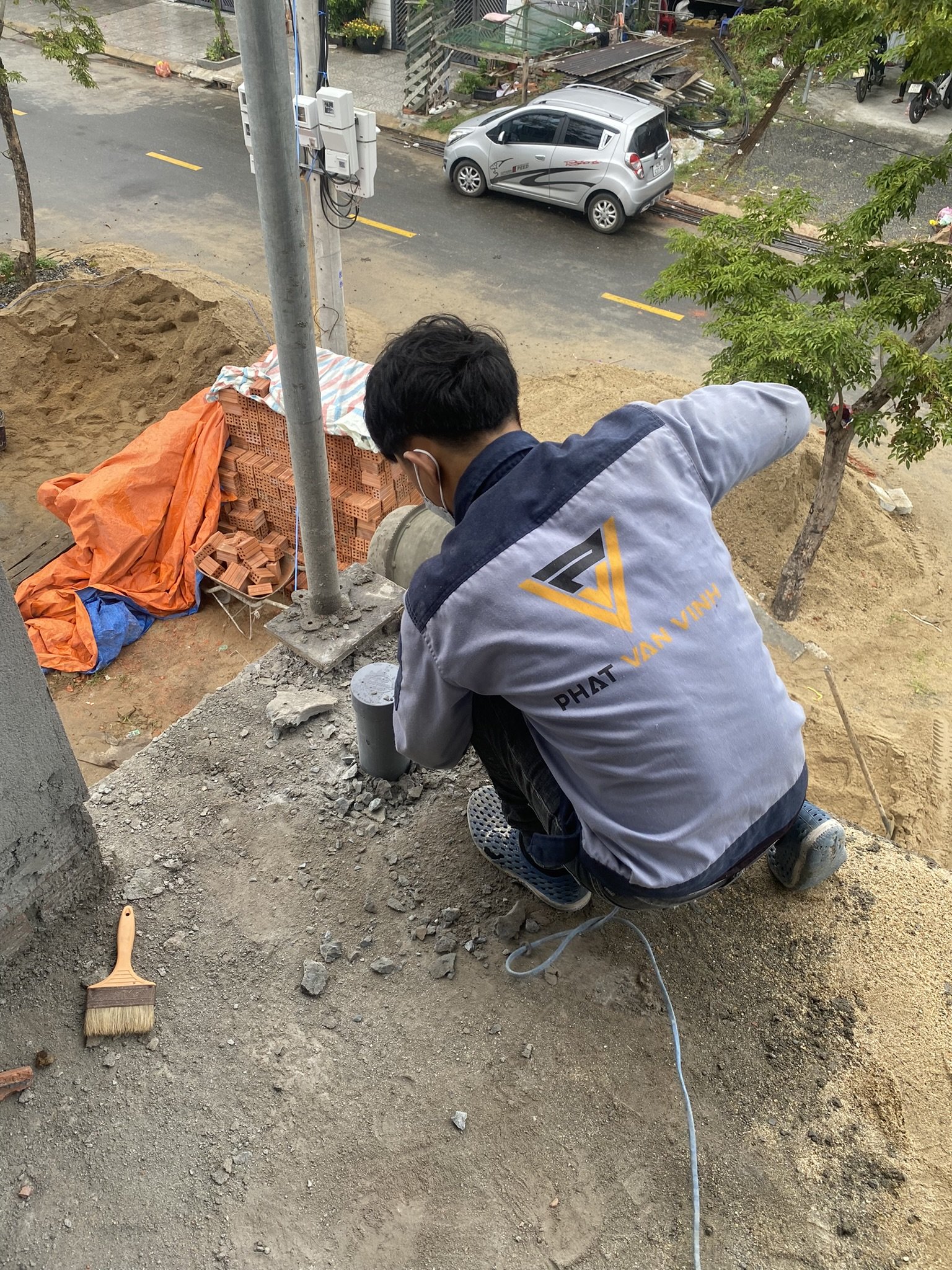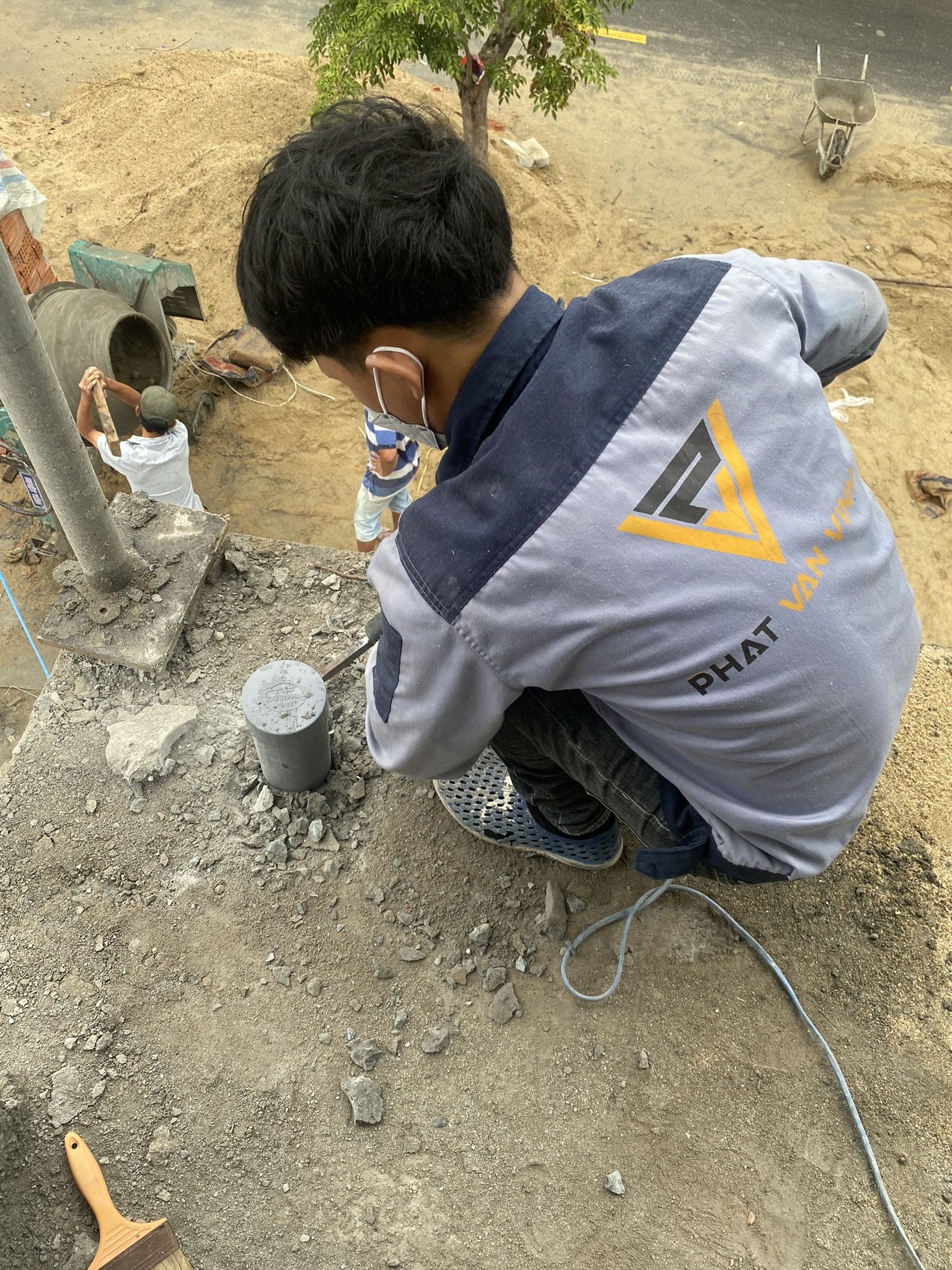 Việc làm sạch bề mặt xung quanh cổ ống là khâu quan trọng. Bạn nên sử dụng dụng cụ chuyên dụng như cọ sắt, chổi quét hoặc máy thổi bụi để làm sạch bụi bẩn và nấm mốc. Nếu có vật cản quanh cổ ống, cần loại bỏ chúng trước khi thi công. Sau đó, khoét một hố sâu tối thiểu 2cm quanh cổ ống. - Bước 2: Thực hiện chống thấm tiêu chuẩn